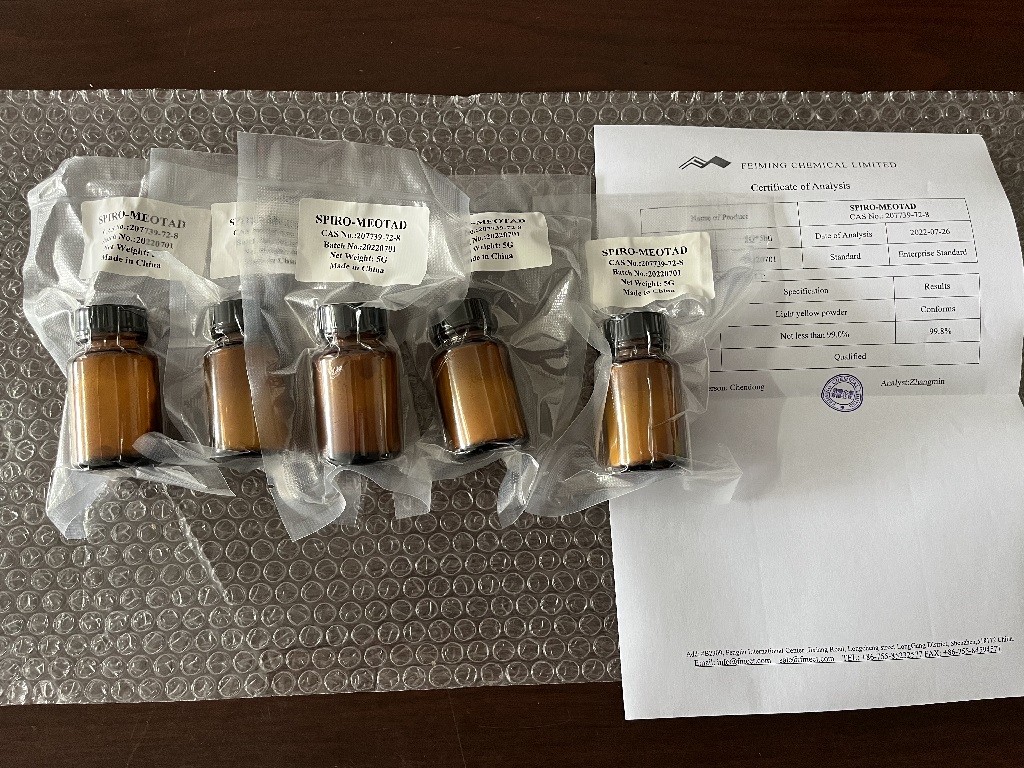 1Le Spiro-OMeTAD a une grande mobilité de support, ce qui signifie que dans la batterie, la charge peut être transférée de la couche photosensible à l'électrode plus rapidement,amélioration de l'efficacité de la batterie.